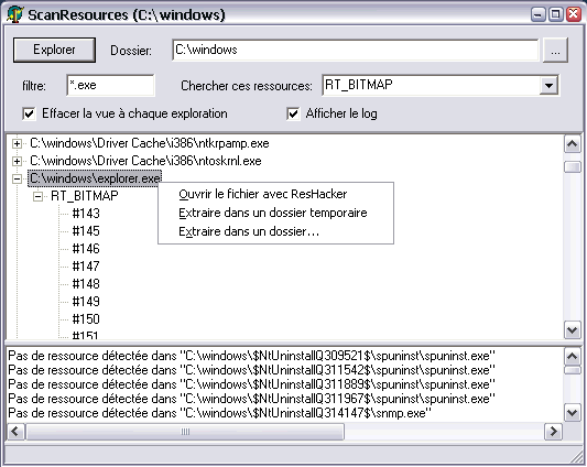 Après avoir cherché sur le web, je me suis aperçu que les programmes existants étaient soit limités, soit payants. Et franchement, je ne suis pas vraiment d'accord pour payer un petit outil de ce genre. Le seul outil vraiment valable que j'ai trouvé est ResHacker. Celui-ci propose de nombreuses fonctionnalités très intéressantes sauf une : la possibilité de scanner (explorer) l'ensemble des ressources de nombreux fichiers à la fois.