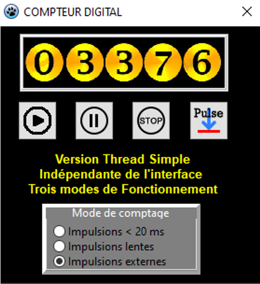 Suite un source que j'avais déposé auparavant par l'utilisation de ProcessMessage pour gérer rapidement un compteur digital, la communauté a réagi en me proposant de passer par les threads. Je remercie en particulier Roland Chastain et Andnotor pour leurs remarques qui m'ont poussé à approfondir les Threads qui offrent de belles possibilités à la condition de bien comprendre la répartition des différents temps des processus et du processeur. Les sources répartis dans trois sous répertoires représentent une évolution de possibilités pour laisser la main à l'utilisateur pendant l'exécution d'un processus...